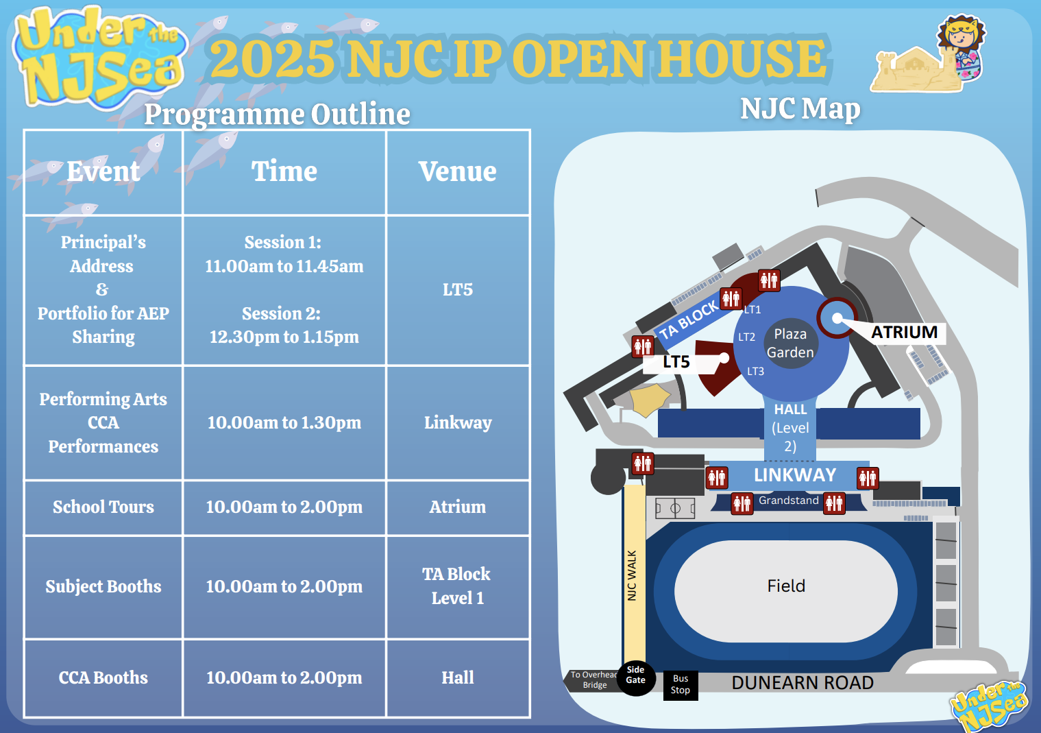 NJC would like to invite all P6 students and parents to visit our upcoming Integrated Programme (IP) Open House this Saturday, 10 May 2025, any time between 10am-2pm. You may attend our Principal's Talk, visit our subject and CCA booths and interact with our students and staff to find out more about NJC IP, watch performances put up by our Performing Arts CCA students and enjoy the distinctive warm and welcoming NJC vibe as you explore our campus. You may refer to the attached programme sheet for more information.